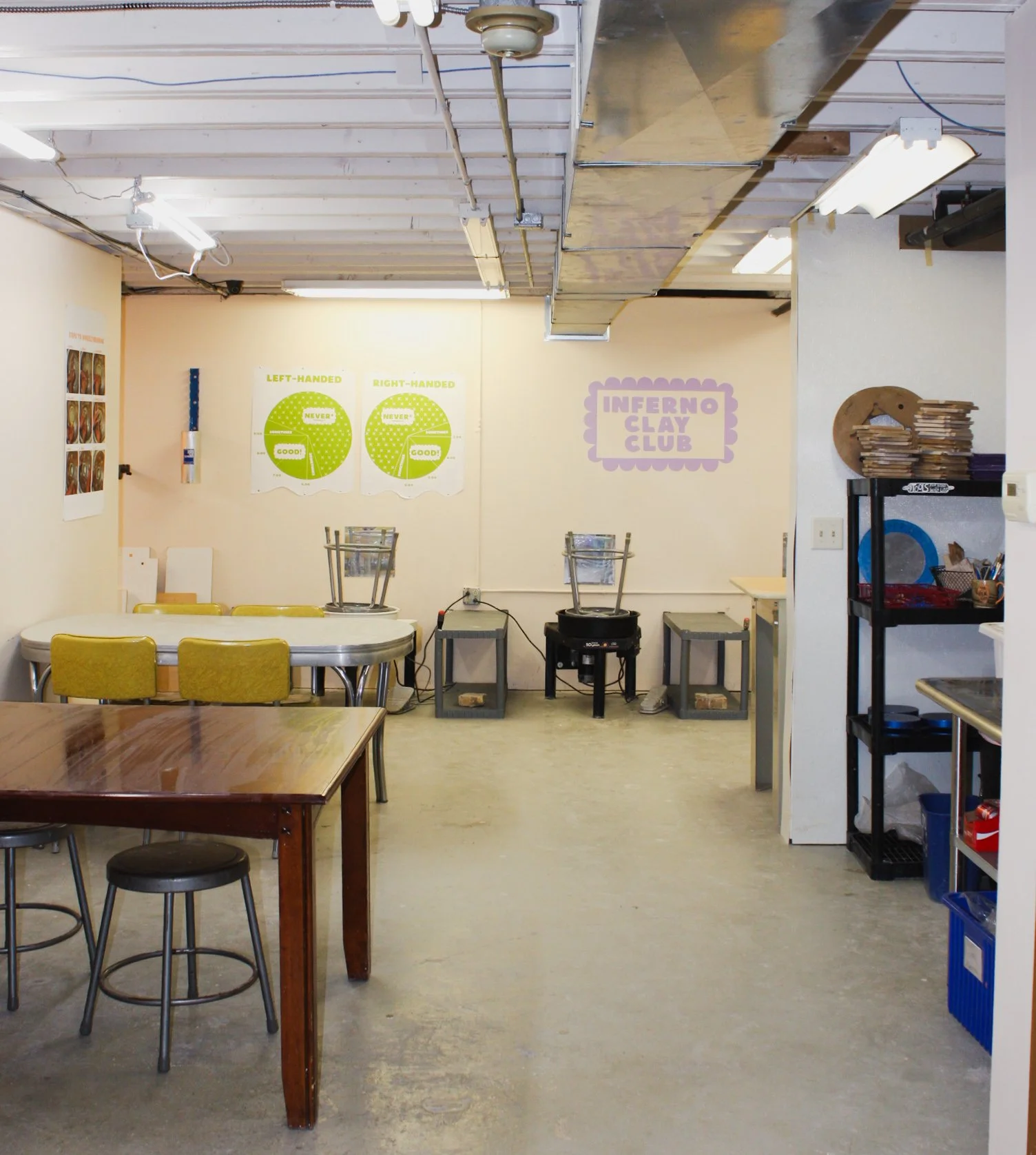 -access to professional equipment (3 Brent cxc wheels, 30” slab roller, wall-mounted clay extruder, Skutt Km-1027 electric kiln (up to ∆ 8), various hand tools, Shimpo banding wheels)